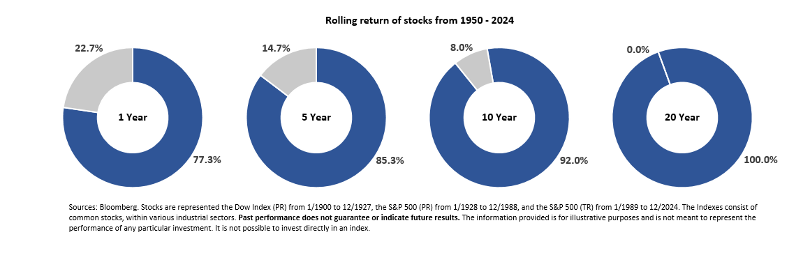 This chart above shows that the longer money stays invested in the market, the more likely it is to grow. Over time, the odds of a positive return have been overwhelmingly in your favor—unlike cash, which quietly loses value to inflation year after year.