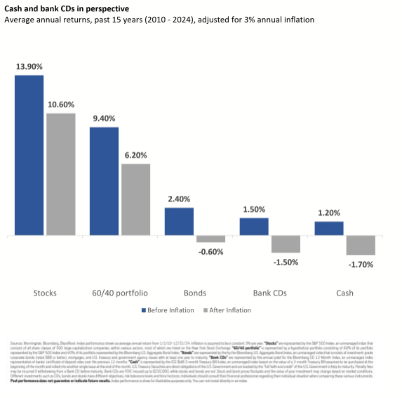 But if you’re thinking long-term—college in 10 years, or care expenses decades from now—then staying in cash means locking in a loss.